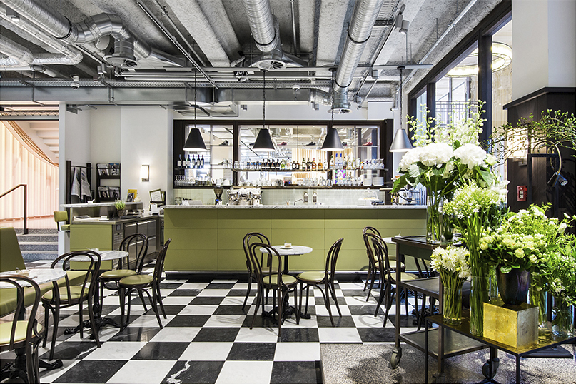 Moderne Gastronomie-Innenarchitektur mit Barbereich, Pflanzen und schwarz-weißem Fliesenboden